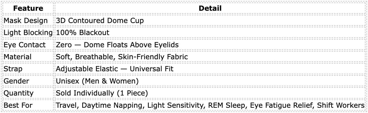 - Zero Eye Pressure — Sleep Without Contact, Wake Without Marks Traditional flat masks press directly onto your eyelids throughout the night, interfering with natural eye movement during REM sleep and leaving uncomfortable indentations on your face by morning. The dome cup design keeps the entire mask surface elevated above your eyelids — no contact, no pressure, no disruption to the REM cycle your brain depends on for true recovery and mental restoration.
