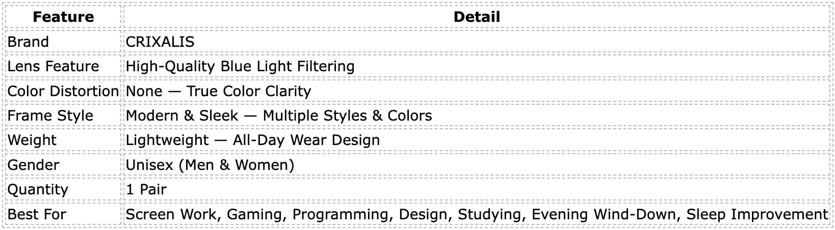 CRIXALIS Blue Light Blocking Glasses — high-quality filtering lenses for digital eye strain relief, screen headache reduction, and improved sleep quality. No color distortion, lightweight all-day comfort, modern unisex frames available in multiple styles and colors. Built for remote workers, gamers, programmers, and anyone whose eyes deserve better protection from daily screen exposure.