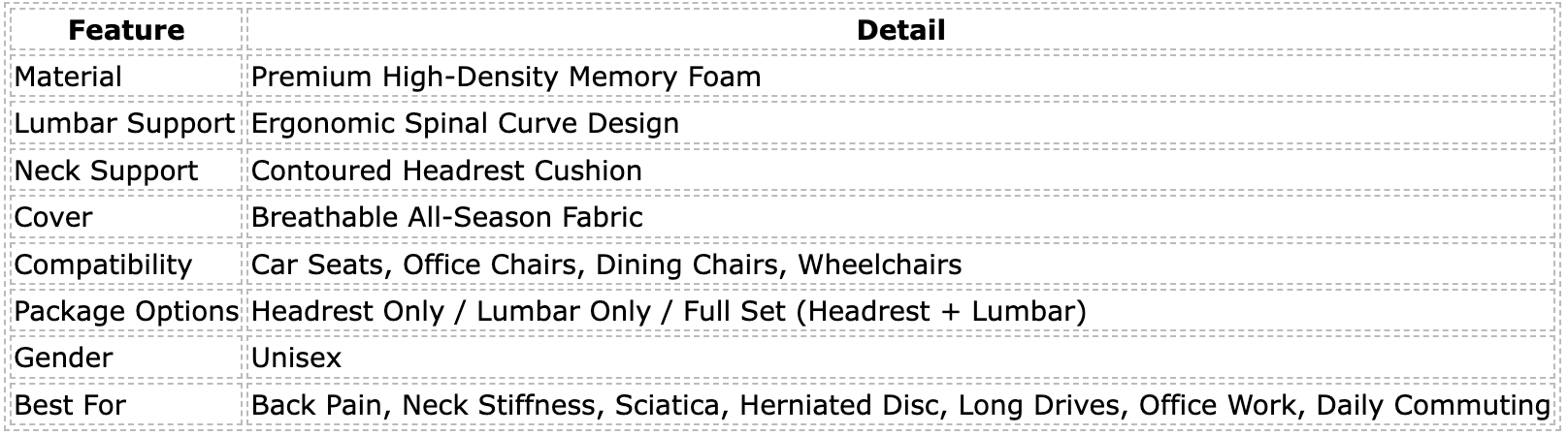 - Set: 1x Headrest Cushion + 1x Lumbar Waist Cushion