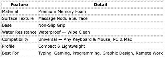 - Ergonomic Memory Foam — Support That Shapes Itself to You Premium memory foam conforms to the exact contour of your wrist, distributing pressure evenly and maintaining a neutral joint position throughout your session. No hard edges, no pressure points — just personalized cushioning that reduces strain and helps prevent the repetitive stress injuries that come with long-term keyboard and mouse use.