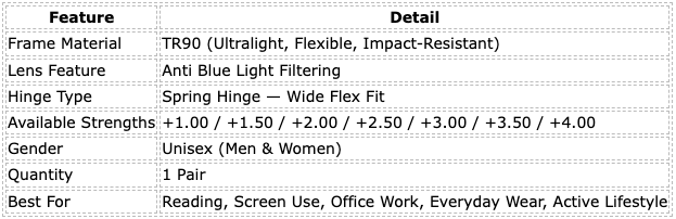 - Ultralight TR90 Frame — Virtually Unbreakable, All-Day Comfortable TR90 is one of the most advanced eyewear materials available — incredibly lightweight, highly flexible, and resistant to snapping under pressure. Frames you forget you're wearing, built to survive the drops, bends, and daily wear that destroy ordinary reading glasses. Ideal for full-day use at the office, at home, or on the go.