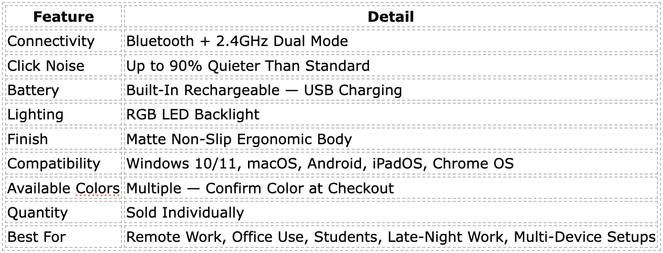 ✅ Open-office and coworking space professionals who need silent, distraction-free clicking ✅ Remote workers and work-from-home professionals upgrading their desk setup ✅ Students working late in libraries, dorms, or shared study spaces ✅ Multi-device users who switch between laptops, tablets, and desktops daily ✅ Anyone tired of replacing AA batteries in a conventional wireless mouse ✅ Desk setup enthusiasts who want RGB aesthetics without sacrificing performance or comfort